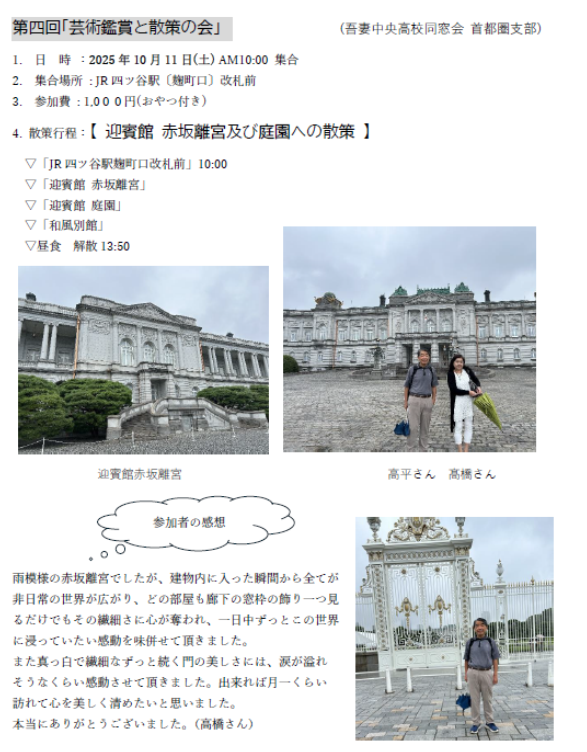 年に2回ほど開催している「芸術鑑賞と散策の会」は4回目となりました。今回は、普段訪れる機会の少ない「迎賓館 赤坂離宮」でした。