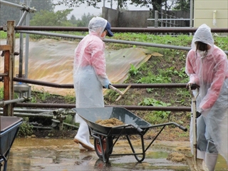 8月下旬より天気が不安定な日が続いており、本日(9/6)の実習時も雨が降っていました。また、生徒たちが活動している時間は、特に、強く雨が降っており、生徒たちは雨合羽を着用して実習を行いました。また、ミニチュアホースは小屋を掃除している間、いつもは屋外で待機をしています。しかし、外の雨の様子もあり、屋内で待機をしてました。今後もこのような日が続くと思いますが、秋晴れ日もあるといいですね。