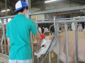 「動物科学研究部の取り組み(審査牛の手入れ・取材の様子)」