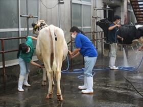 動物科学ニュース397 動物科学研究部の活動③ 投稿日時 : 2020/07/10 美野原農場 カテゴリ:令和02年07月 動物科学研究部の活動③ 美野原農場 動物科学研究部は放課後に美野原農場で毎日活動をしています。今回は乳牛の洗体について取り上げます。洗体とは体を洗うことで、乳牛の体をきれいにすることは衛生面はもちろん、人間になれる意味もあります。さらに、体をブラシなどで洗うことで、ウシにとってマッサージ効果もあるようです。下の写真は「洗体をしているところ(左)」と「体をふいているところ(右)」です。 ▲美野原農場TOPへ戻る 0 {{options.likeCount}} {{options.likeCount}}